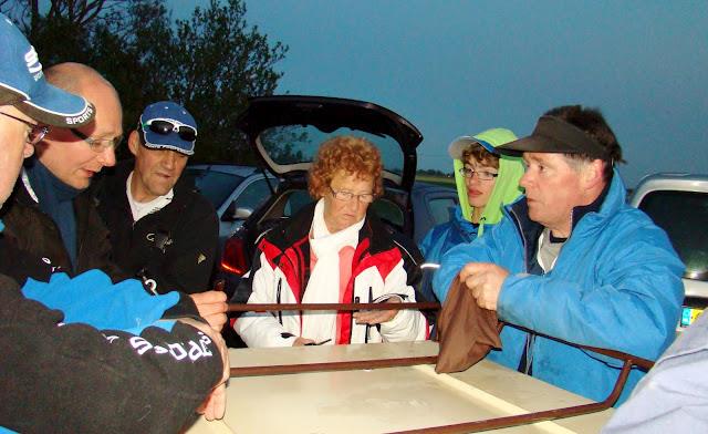 Afgezien van de loeiende koeien kun je je geen groter contrast met bovengeschetst plaatje voorstellen. Windkracht 4/5 schuin rechts van voren en een temperatuur die gedurende avond zakt naar 4 graden. Negen mannen en een vrouw aan de waterkant in blauwe en groene berepakken, nog net niet met ijspegels onder de neus, de kou trotserend. En zoals het hoort bij barre omstandigheden treden er dan ook bizarre ongelukken op. Jaap Zuidhoek loopt plotseling tijdens het opbouwen enigszins verdwaasd achter mij langs. Zijn handen vol bloed. Hij is door zijn stoel gezakt en heeft zijn vinger daarbij flink opengehaald. Mijn verbanddoos in de auto biedt uitkomst. Zes pleisters moeten het bloed stelpen. Maar helpen doet het niet, want een half uur later zijn de pleisters er al weer door het bloed afgedreven. Hennie, zijn vrouw, roept om naald en draad, maar meer dan een boilienaald en 8 honderdste gevlochten lijn hebben we niet in de aanbieding. Dus nog maar wat kompressen en pleisters erop, want opgeven doen we natuurlijk niet.