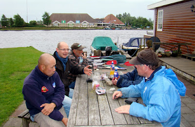 Als we om 7.00 verzamelen bij bootverhuur Hollema in Eernewoude staan er dan ook 9 bikkels goedgemutst bij. Piet Hoekstra is met zijn eigen boot vanuit Hempens komen varen en kijkt hoofdschuddend toe terwijl Hans en Hans hun rijdende viscontainers aan het uitladen zijn. Ze proppen complete visopstellingen op hun bootje dat amper 3m2 ruimte biedt. Ondertussen word er al flink gegrapt, gegrold en geouwehoerd; overallconclusie is dat het vandaag een gevecht tegen de bierkraan wordt.
