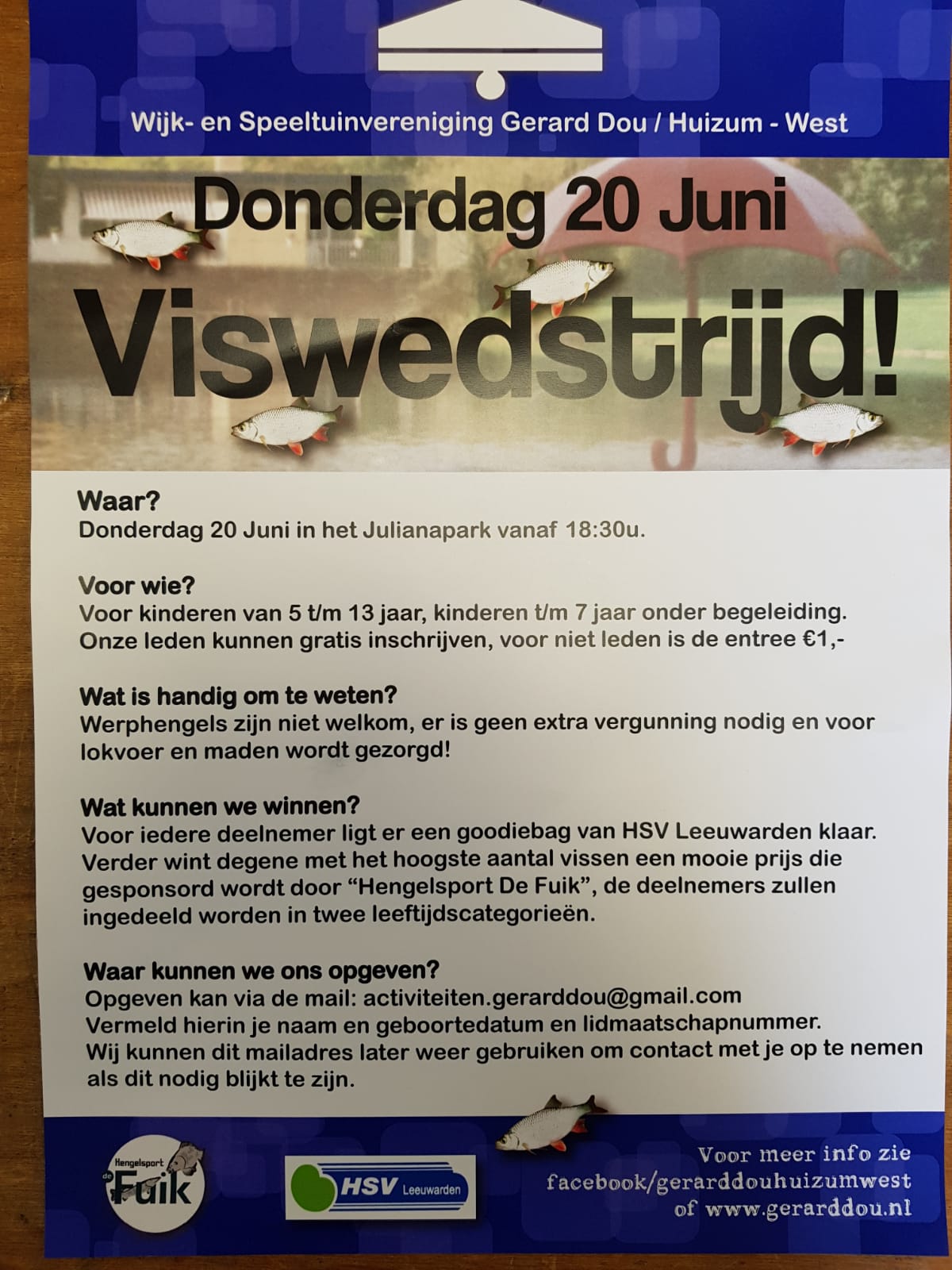 20 juni houdt jeugdcommissie van de HSV Leeuwarden i.s.m. Wijk- en speeltuin vereniging Gerard Dou/ Huizem-West een jeugdviswedstrijd.