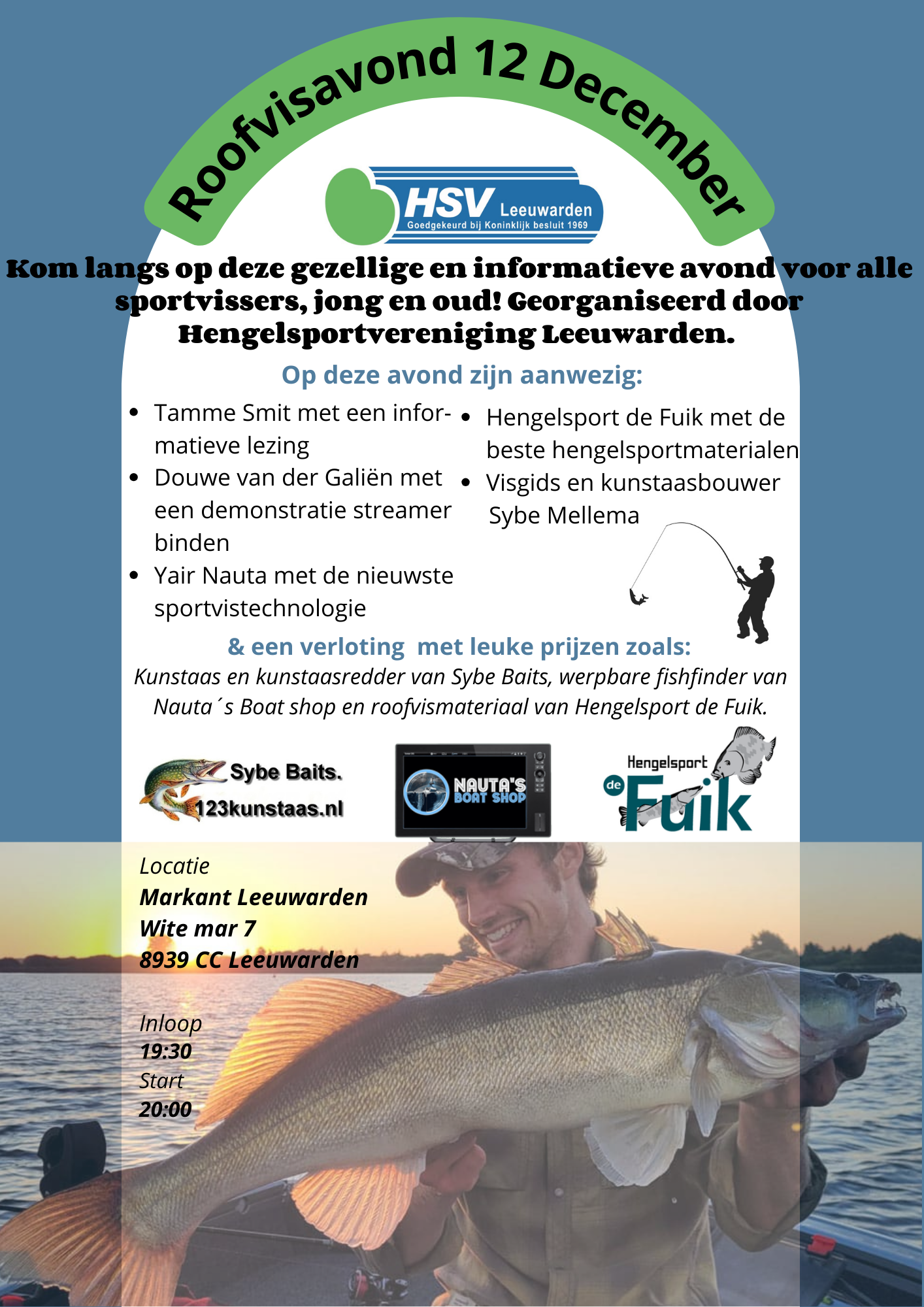Donderdag 12 december hebben we een geslaagde roofvisavond gehad! Met ruim 160 man die kwamen voor een informatieve lezing over snoek en snoekbaars van Tamme Smit, nieuwe visspullen te bewonderen van onder andere Yaïr Nauta met zijn fishfinders, Sybe Mellema met zijn met de hand gemaakte kunstaas, hengelsport de Fuik met allerlei mooie en handige spullen en Douwe van der Galiën met zijn ter plekke gebonden streamers. Maar ook de vele leuke prijzen en natuurlijk de gezelligheid! Bedankt voor jullie komst en hopelijk tot de volgende roofvisavond, of de karperavond waar we momenteel mee bezig zijn om te realiseren!